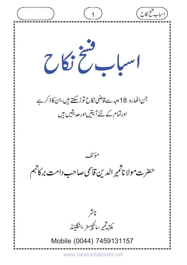 اسباب فسخ نکاح 1 Comment / Jurisprudential issues || فقہی مسائل, Latest || تازہ ترین / By eislamicbook وہ اٹھارہ وجوہات جن کی وجہ سے جج نکاح توڑ سکتا ہے۔ باحوالہ دلائل کے ساتھRead OnlineDownload (1MB)Link 1 Link 2